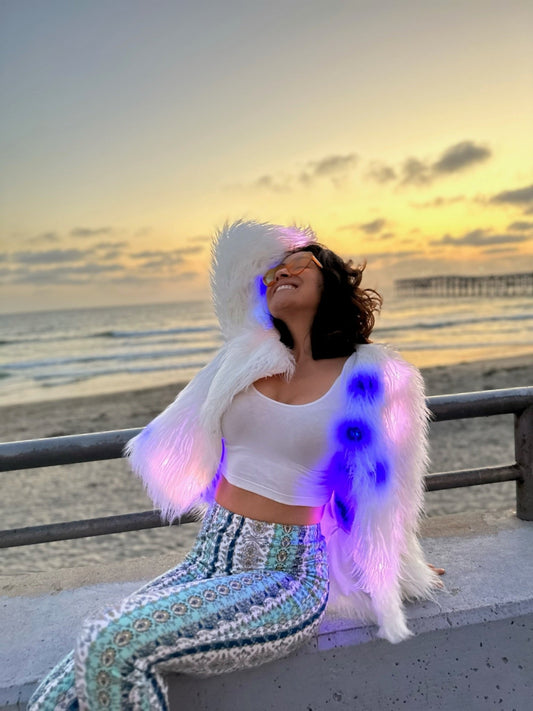 White Faux Fur Glow Jacket with ,featuring cutting-edge Smart LED Lights